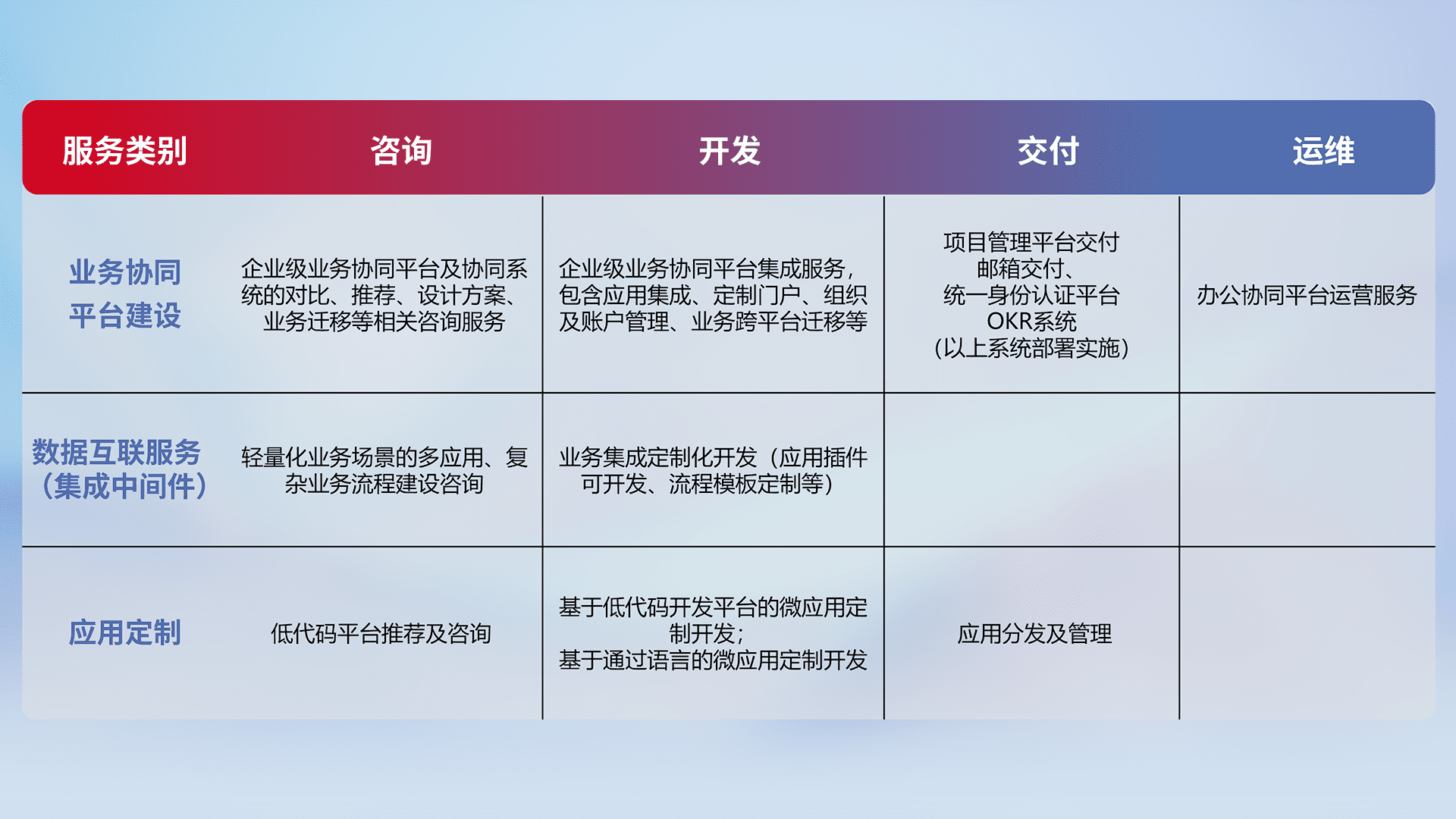 针对钉钉、、企微、、、、IDaas等平台级产品提供产品的规划、、、、方案、、、交付、、、定制化开发等服务,,实现如统一协同办公、、、、智能客户服务、、、混合会议管理、、智能数据查询、、、、等业务场景,,,实现数字化转型。。。。
